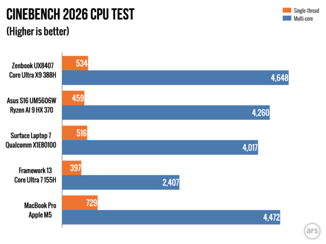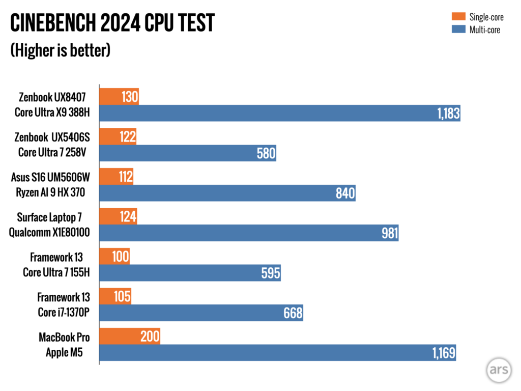 Single-core performance is around 10 percent faster than Core Ultra 200V, the Ryzen AI 9 HX 370, and the Snapdragon chip. The only chips that make Intel’s look bad here are Apple’s—both the M4 and M5 boast considerably higher single-core performance.