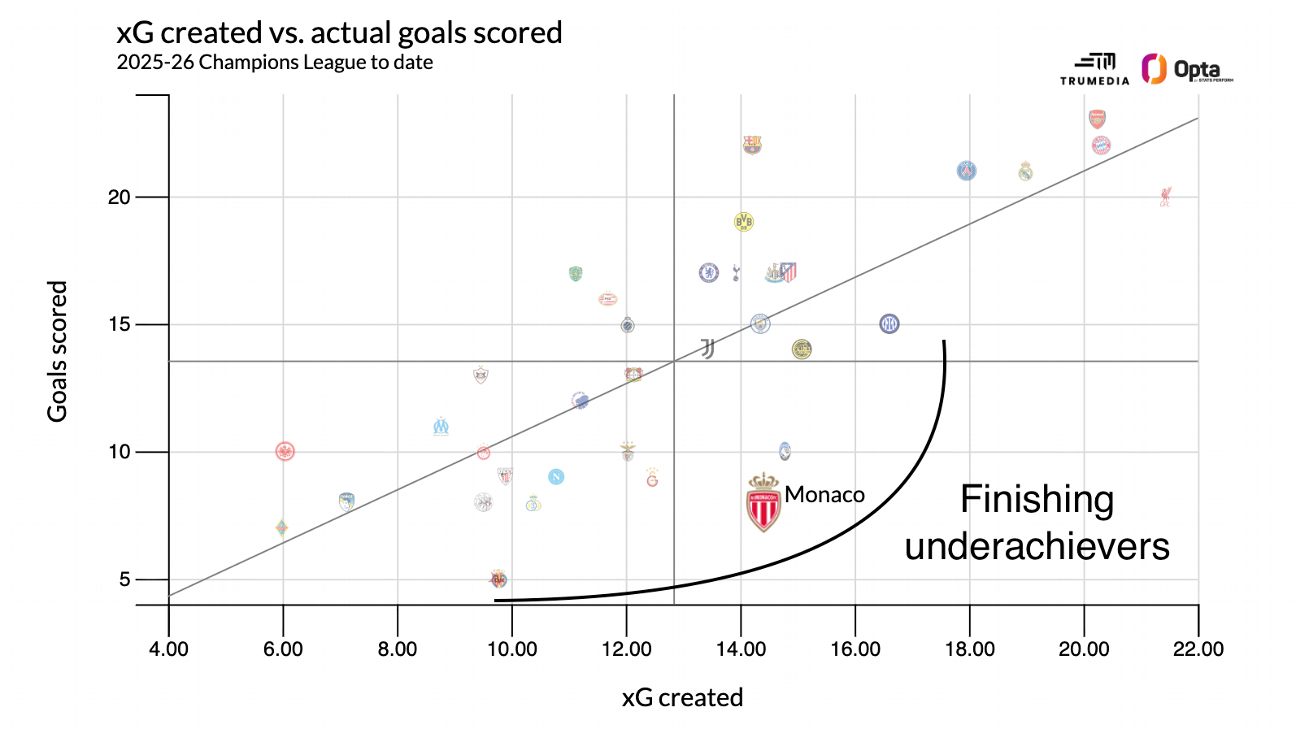 Why they will: All they need is some finishing. We’re not used to attack being an issue for a Monaco club that have boasted an endless list of great forwards through the years. But the single biggest issue for the club this season is that none of their current attackers can actually stick the ball into the net. In all competitions, Folarin Balogun has scored eight goals from shots worth 11.6 xG (underachievement of 3.6 goals), Maghnes Akliouche has scored four from shots worth 9.1 (a ghastly minus-5.1), and Monaco as a whole have underachieved against their xG totals by 14.4 goals.