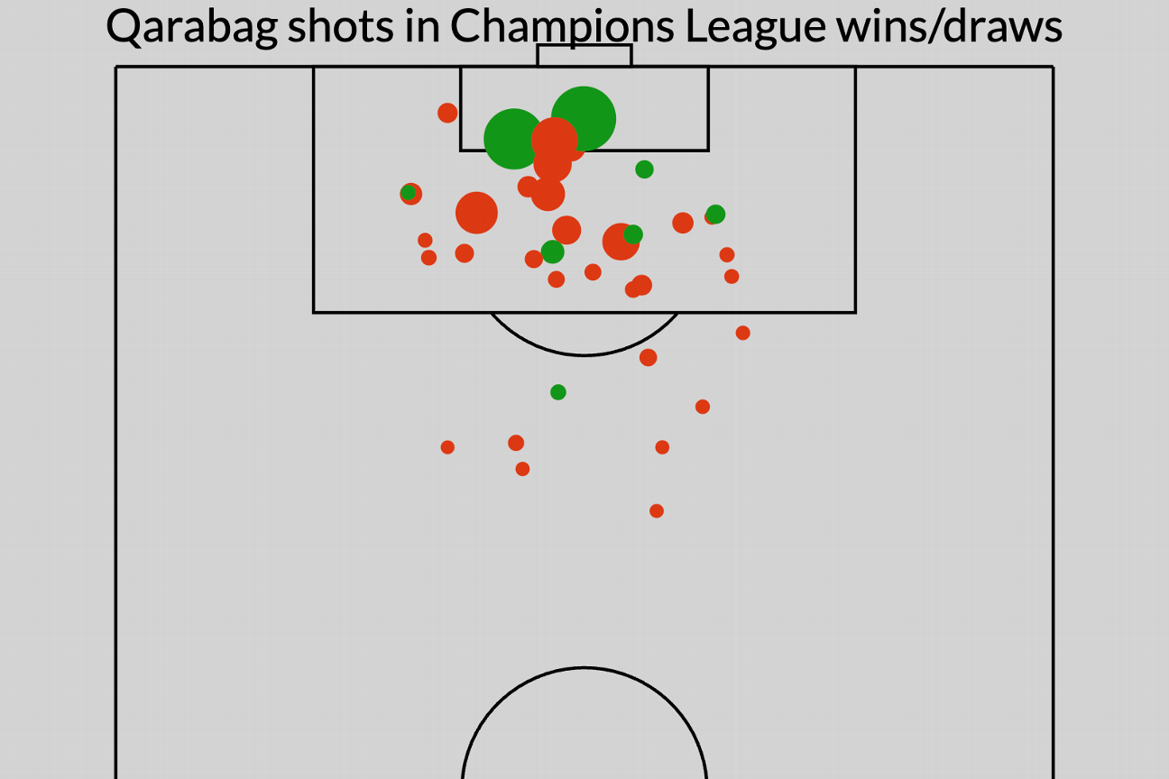 Green dots = goal; red dots = no goal. The larger the dot, the higher the xG, and Qarabag have created plenty of big dots