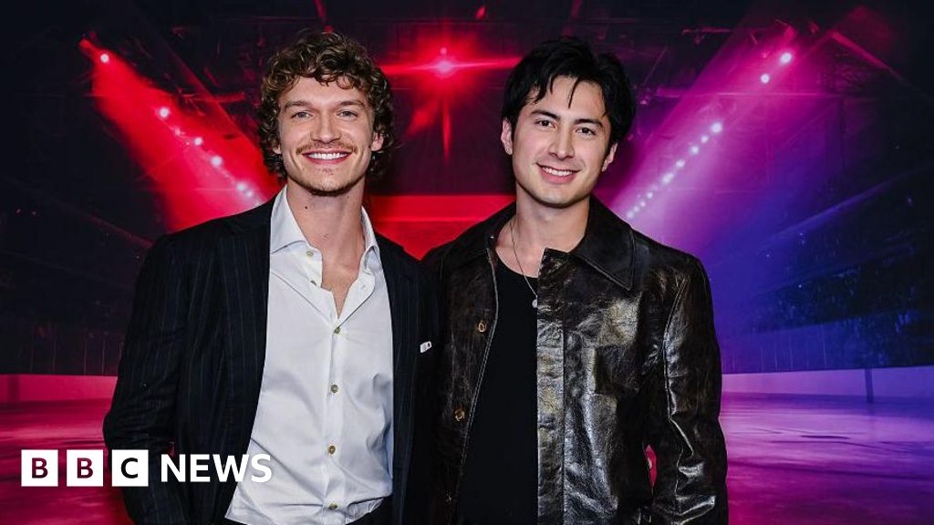 Getty Images Two young men, one in a black suit with open-necked white shirt, and one in a black leather jacket, pose for a photo in front of a large photo of a moodily lit, empty ice hockey rink.Getty Images